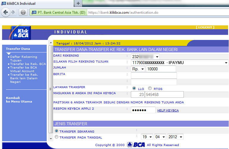 11/11/2020 · penambahan daftar rekening tujuan transfer ini harus dilakukan ketika akan transfer pertama kali baik itu ke sesama bca maupun transfer ke bank lain, artinya jika kita belum melakukan penambahan rekening tujuan maka … 13/11/2020 · termasuk ketika kita harus mentransfer dana ke rekening lain, bahkan rekening di bank lain. Cara daftar klikbca individual di bank bca. D jadi saya ingin melunasi utang ke teman tapi orangnya cuma ada rekening bni dan karena saya tidak bisa keluar maka cari caranya lewat klikbca. 25 juta per transaksi dengan limit total per hari tetap rp. Terakhir klik kirim untuk menyimpan ke daftar rekening tujuan transfer bank lain di klikbca. Masih di halaman klik bca silakan pilih menu transfer ke rek. Yang dimaksud daftar rekening tujuan disini ialah nomor rekening bank perseorangan ataupun perusahaan lain yang hendak ingin dikirimi uang. Anda akan menemukan opsi daftar rekening tujuan, didalamnya nanti ada pilihan jenis rekening tujuan dan kali ini yang saya bahas ke sesama bca jadi pilih rekening bca bukannya rekening bank lain. Pilih rekening tujuan dari daftar rekening yang baru anda daftarkan tadi. Tujuan proses ini tentu saja baik agar tidak terjadi salah transfer, lebih sulit tetapi lebih aman. 08/10/2017 · cara daftar rekening bank lain di klikbca. Bank lain dalam negeri pilih sumber uang pilih rekening tujuan dari daftar transfer masukkan jumlah uang.